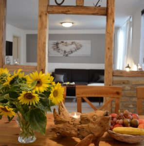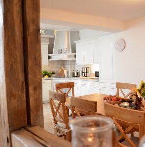 Die Ferienwohnung „Captains Quarters“ für 4 Personen ist ausgestattet mit zwei Schlafzimmern mit jeweils einem Doppelbett ( 1x 160 x 200 , 140×200), Duschbad mit Fußbodenheizung, geräumiger Küche mit großem Essbereich und Einbauelementen: Geschirrspüler, Mikrowelle und Backofen, einem Wohnzimmer mit Kamin für gemütliche Stunden. Alle Zimmer sind mit LCD-Flachbildfernseher ausgestattet, welche über Kabelfernsehen verfügen. Auf der dazugehörigen Terrasse mit entsprechendem Mobiliar kann entspannt und gegrillt werden ( Grill vorhanden). Zu dieser Wohnung gehört unsere „kleine Piccolo-Sauna“